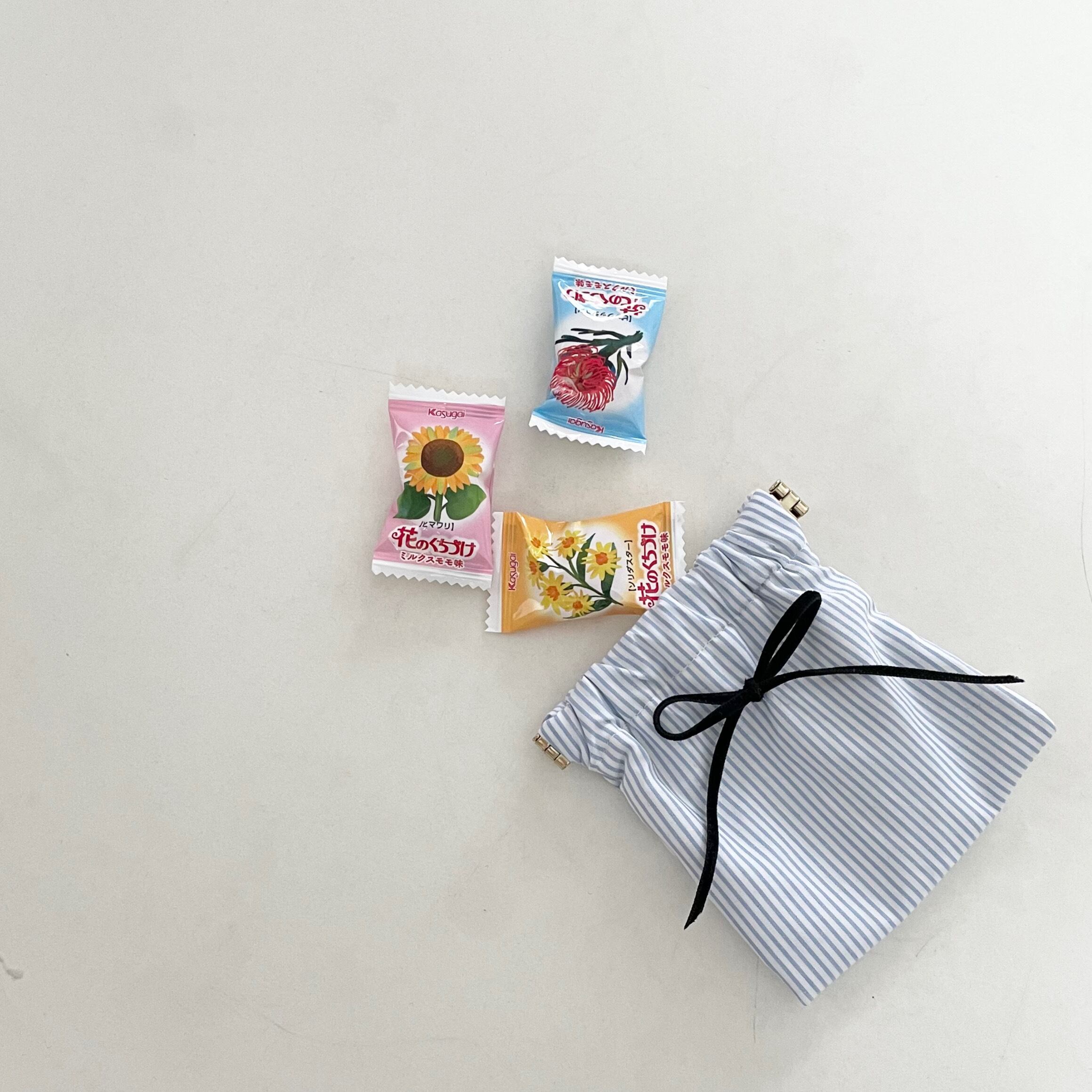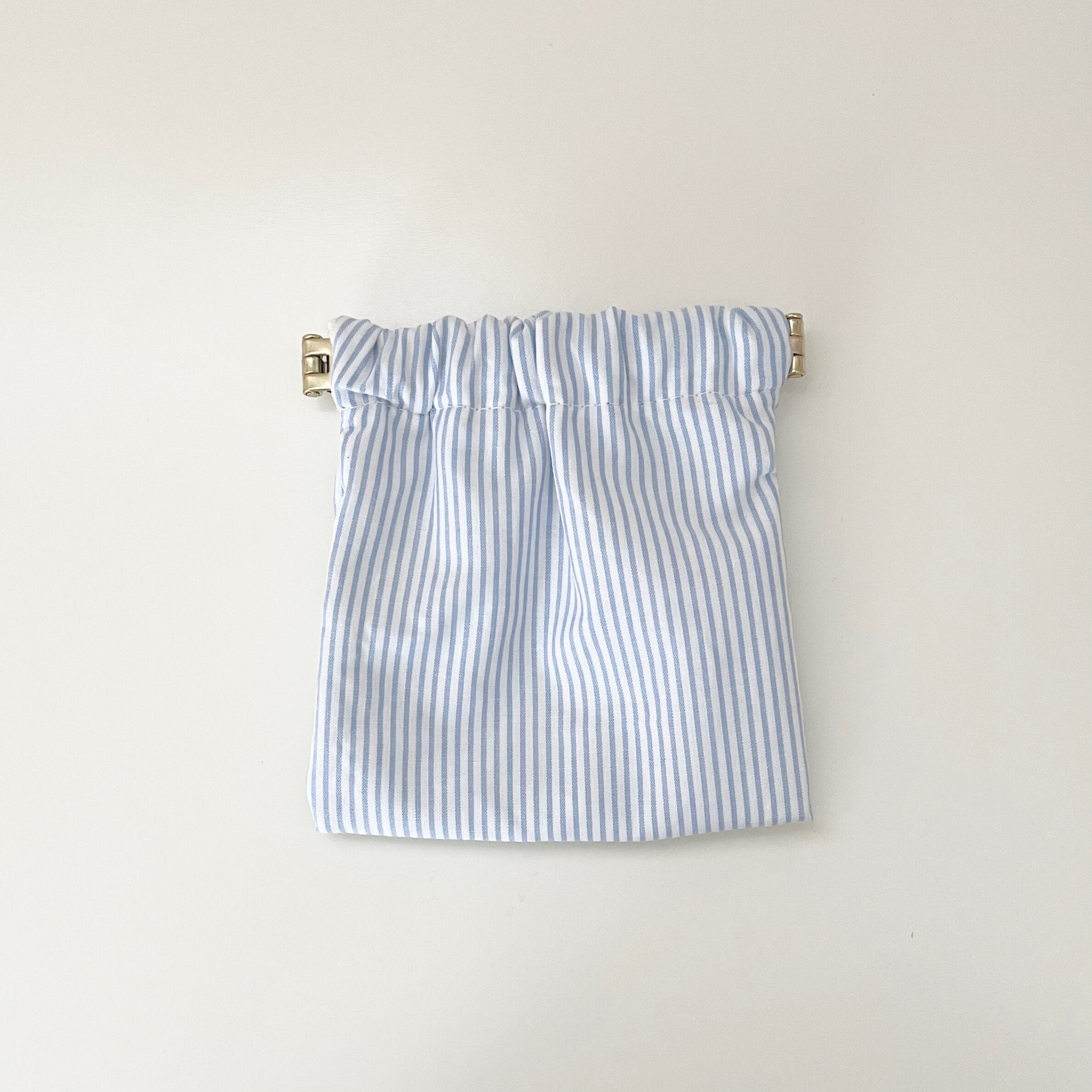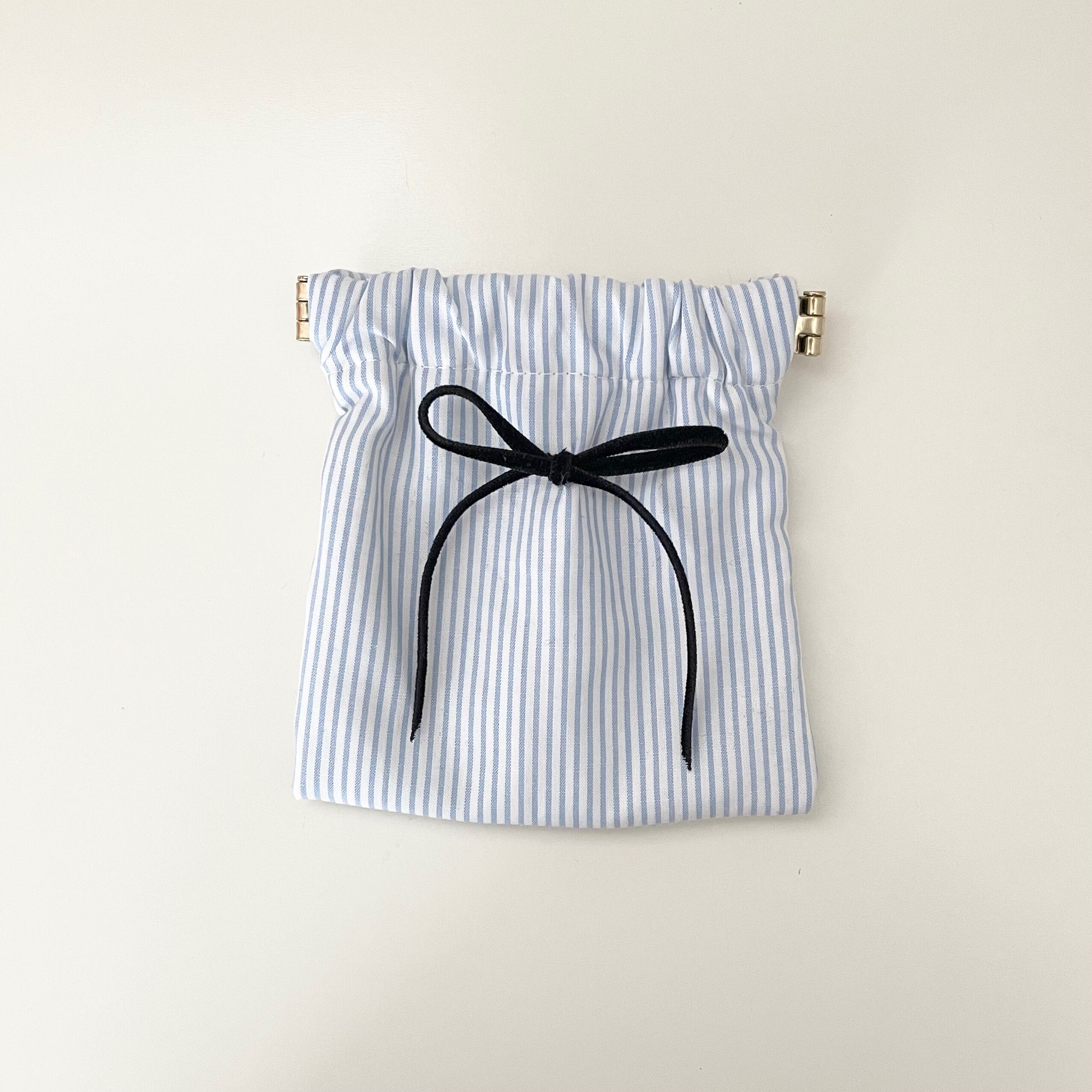 ブルーストライプ柄のミニポーチです。ブラックリボンで少し可愛らしく…